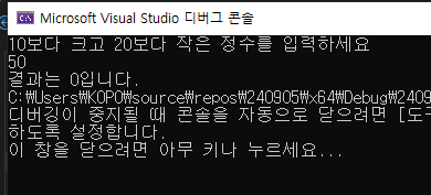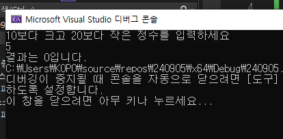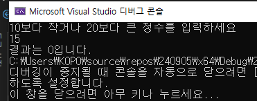printf("10보다 작거나 20보다 큰 정수를 입력하세요\n");