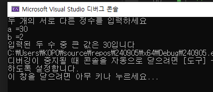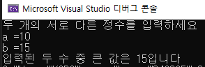 printf("입력된 두 수 중 큰 값은 %d입니다", a < b ? b : a);